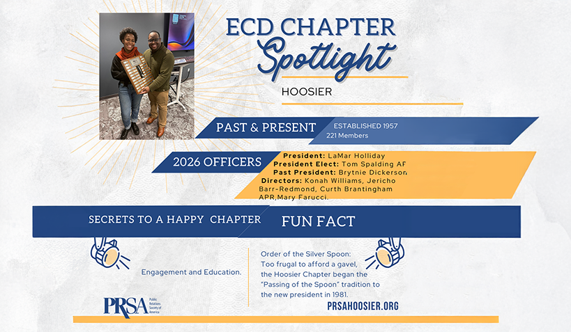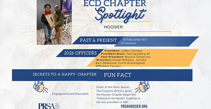 January is “New Leadership Month” on the ECD calendar so it is appropriate to dedicate the first ECD Chapter Spotlight of 2026 to the PRSA Hoosier Chapter. We celebrate our colleagues in Indiana for their new chapter leadership, and we welcome two Hoosier chapter members to new leadership roles on the 2026 ECD Board.
